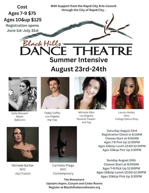 6 Professional artists are ready to share their knowledge and experience in the industry with dancers in the Black Hills and surrounding communities! Ages 7 and up are welcome! Registration is open NOW! Deadline to complete your registration is July 31, 2025. Intensive will be held at The Monument in Rapid City.